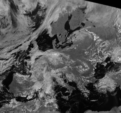 Über dem Golf von Genua liegt das Tiefdruckgebiet 'Leo', das über Südwesteuropa für meist dichte Wolken, Schauer und Gewitter sorgt. Über Schweden, Finnland und Nordrussland kommt es unter dem Einfluss von Hoch 'Petra' zu größeren wolkenfreien Gebieten. Dabei sind die großen Seen gut erkennbar.