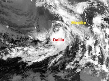 Vor ein paar Tagen hat sich vor der Westküste Mexikos der Wirbelsturm 'Dalila' entwickeln. Er erreicht derzeit mittlere Windgeschwindigkeiten von etwa 100 km/h, in Böen bis zu 115 km/h und hat damit sein Maximum erreicht. Sein weiterer Weg führt ihn unter Abschwächung nordwestlich an Niederkalifornien vorbei, wobei er die Küste wohl nur streift und sich wieder abschwächt. (Bildquelle: NERC Satellite Receiving Station, Dundee University, Scotland, http://www.sat.dundee.ac.uk/)