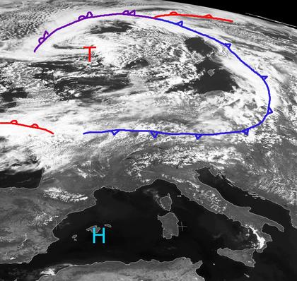 Tief 'Monika' bei Norwegen liegt heute Mittag mit seinen Wolken über vielen Teilen Mitteleuropas. Es sorgt teils für Regen, teils aber auch für Schauer wie etwa über Skandinavien. Weiter nach Süden bringt Hoch 'Roberto' dagegen fast wolkenloses Wetter. Über der Biskaya zeigen sich bereits die Wolken eines neuen Tiefs, dass am Sonntag auch Deutschland erreicht. An seiner Vorderseite wird zuvor unter noch vorherrschendem Hochdruckeinfluss aus Südwesten schwül-heiße Luft nach Mitteleuropa und Deutschland geführt. (Bildquelle: Copyrigt EUMETSAT, NERC Satellite Receiving Station, University of Dundee)