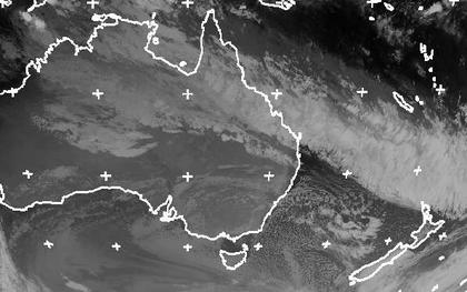 Vom Norden Australiens über den Pazifischen Ozean und über den Norden Neuseelands liegt ein Wolkenband mit Regen. Auch vor der Küste von Neuseeland liegt Bewölkung, die hier weitere Niederschläge bringt. Gleichzeitig markiert dieses Wolkengebilde eine Trennlinie von warmer Luft im nördlich und kalter Luft südlich davon. (Bildquelle: NERC Satellite Receiving Station, Dundee University, Scotland, http://www.sat.dundee.ac.uk)
