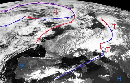 Tief 'Viola' über dem Baltikum und Tief 'Wolfhilde' über Kroation haben am Montag Mittag mit ihren dichten Wolken Mitteleuropa kaum verlassen, da kündigt sich schon Wolkennachschub eines Islandtiefs an. Vorübergehend kann ein Keil eines Azorenhochs über Spanien aber auch Deutschland erreichen. Somit sind in diesem Bereich die Wolkenlücken etwas größer. Auch im Südosten bringt ein Hoch wolkenarmes Wetter. (Bildquelle: Copyrigt EUMETSAT, NERC Satellite Receiving Station, University of Dundee)