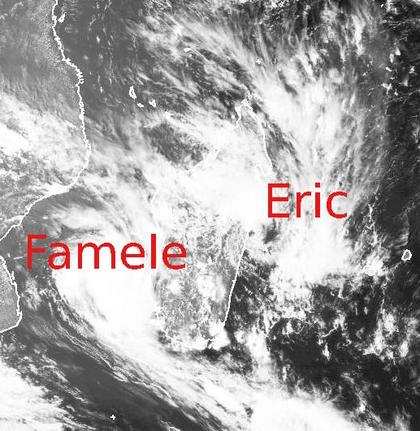 Zwei Zyklone liegen derzeit an den Küsten von Madagaskar: 'Eric' mit Böen bis zu 85 km/h im Osten und 'Famele' mit Böen bis zu 130 km/h im Westen. Sie werden sich voraussichtlich noch leicht verstärken, dennoch bleiben die Windgeschwindigkeiten für einen tropischen Wirbelsturm im mäßigen Bereich. Es ist aber mit teils sehr ergiebigen Regenfällen zu rechnen.