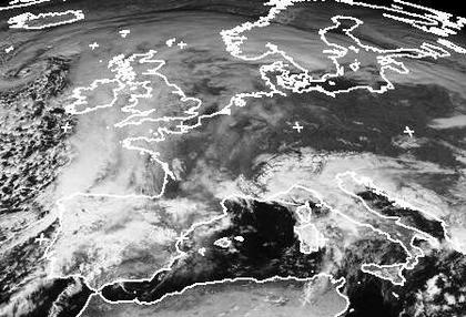 Das Zentrum von Tief 'Steffi' liegt auf dem Atlantik südlich von Island. Das Wolkenband seiner Warmfront erstreckt sich auf dem Satellitenbild vom Sonntagmittag von den Färöerinseln über Südskandinavien bis ins Baltikum. Südlich von ihr strömt trockene und eher milde Luft nach Norden. Dabei ist es über Deutschland meist nur gering bewölkt. Die Kaltfront des Tiefs liegt bei Irland und Portugal. Sie bewegt sich ostwärts und erreicht am Montagmorgen den Westen Deutschlands. (Bildquelle: NERC Satellite Receiving Station, Dundee University, Scotland, http://www.sat.dundee.ac.uk/)