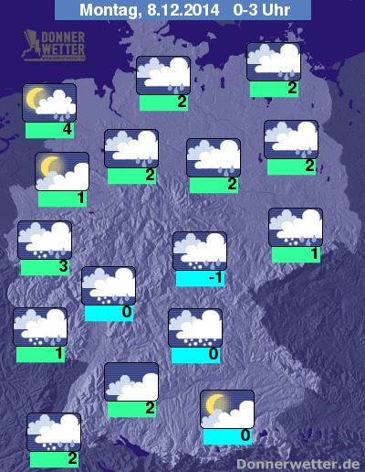 Niederschlagsreicher geht es dann in der Nacht auf Montag zu. In der Nordhälfte fallen die Niederschläge zumeist als Regen, in der Südhälfte auch als Schneeregen oder Schnee. Tiefstwerte um 4 Grad C in Ostfriesland und um -1 Grad C im Thüringer Wald.