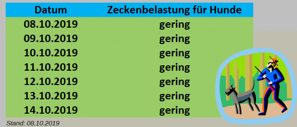 Hundebesitzer und ihre Vierbeiner müssen beim herbstlichen Spaziergang nur noch geringe, in den Risikogebieten im Süden vereinzelt noch mäßige Zeckenrisiken befürchten.
