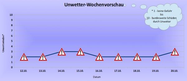 In der kommenden Wetterwoche bleibt die Gefahr durch Unwetter weitgehend niedrig. Bei meist leichtem und überwiegend trockenem Hochdruckwetter sinken jedoch die Temperaturen in der Nacht gebietsweise schon in den frostigen Bereich, so dass zum morgendlichen Berufsverkehr die Straßen durch überfrierende Nässe oder Rauhreif stellenweise glatt werden können.