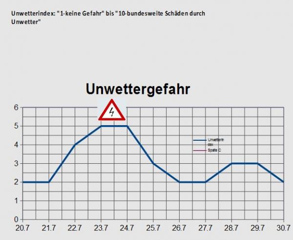 Die Unwettergefahr zeigt sich zu Beginn der kommenden Wetterwoche noch meist sehr gering, sie steigt jedoch ab Wochenmitte spürbar an und liegt am Donnerstag und Freitag auf einem mäßigen und teilweise auch hohen Niveau. Dazu sind regional auch wieder schwere Gewitter, teils mit Unwetterpotenzial möglich. Ab dem Wochenende lässt die Gewitterneigung voraussichtlich jedoch deutlich nach.