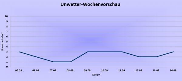 In der kommenden Woche besteht wiederum nur eine weitgehend geringe bis leichte Gefahr vor Unwettern. Regional besteht jedoch vor allem am Montag und ab Freitag ein mäßiges Unwetterrisiko. Insgesamt herrscht im Land jedoch verbreitet ruhiges, spätsommerlich warmes und freundliches Spätsommerwetter.