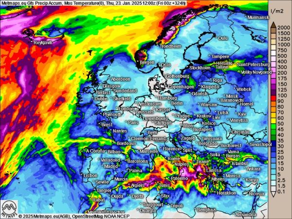 Und damit sind wir in Europa fast alleine, wie auch diese eindruckvolle Karte zeigt: Dargestellt sind die nach dem US-amerikanischen Wettermodell GFS aufsummierten Niederschlagssummen bis zum 23. Januar.