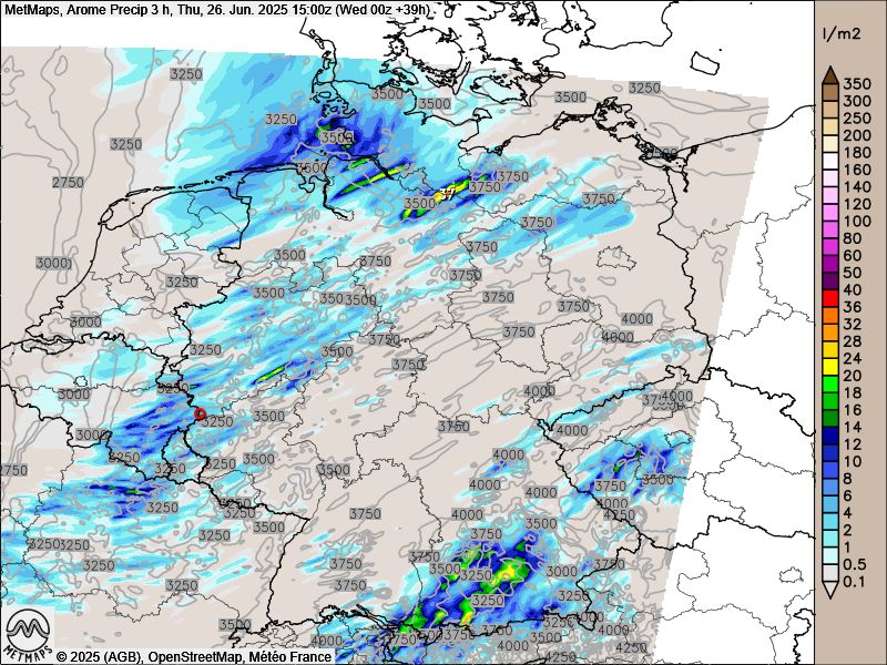 Folgend die CAPE/LIFTED-Index Karte für den Donnerstag nach Arome und die 3-Stunden-Regenkarte bis Donnerstagnachmittag (15:00 Uhr).