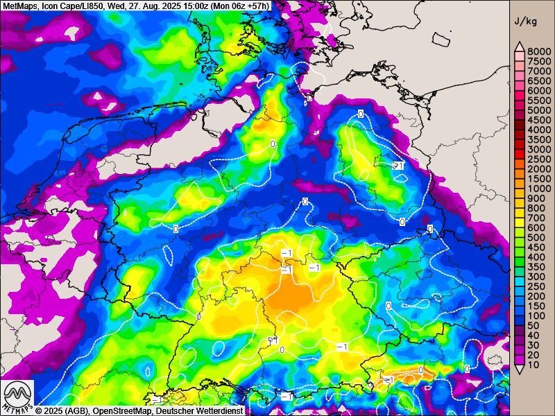 Nachfolgend die Cape-Lifted-Karte für Mittwochnachmittag sowie die Gewittervarianten nach ICON für Mittwoch und Donnerstag: