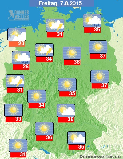 Im Süden und Osten machen die Temperaturen bei häufig wolkenlosem Himmel dann nochmals einen Sprung: Entlang der Elbe sind Höchstwerte um 38 Grad C möglich.