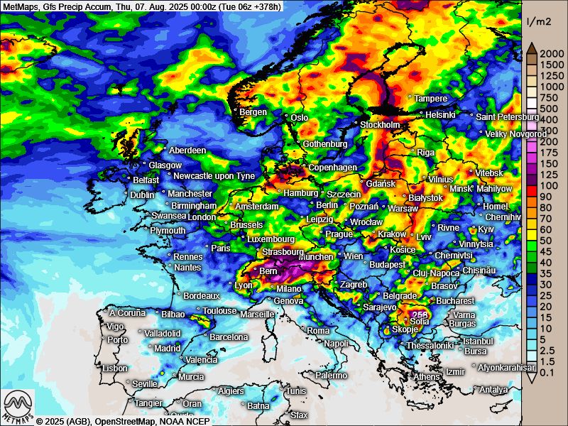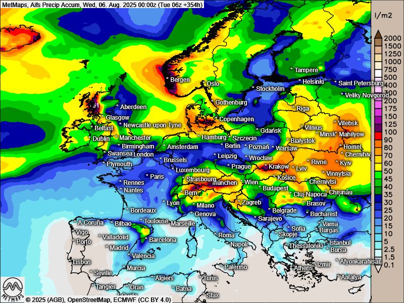 Die beiden Karten zeigen die summierten Regenmengen bis Anfang August nach GFS und AIFS.