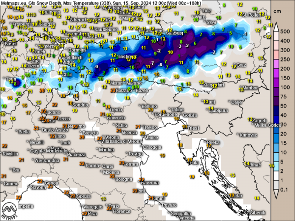 Der aktuelle GFS-Modelllauf (s. Karte unten) geht bis Sonntagmittag in den Alpen von 250-300 l/m² aus (72-Stunden-Regenmenge). Ab 1.200 m Höhe fällt ein Meter Neuschnee und mehr. Bergtouren durch die Alpen sollten am Wochenende daher unbedingt gemieden werden.