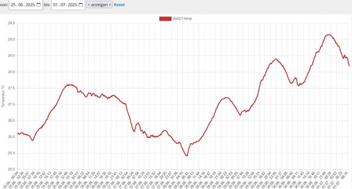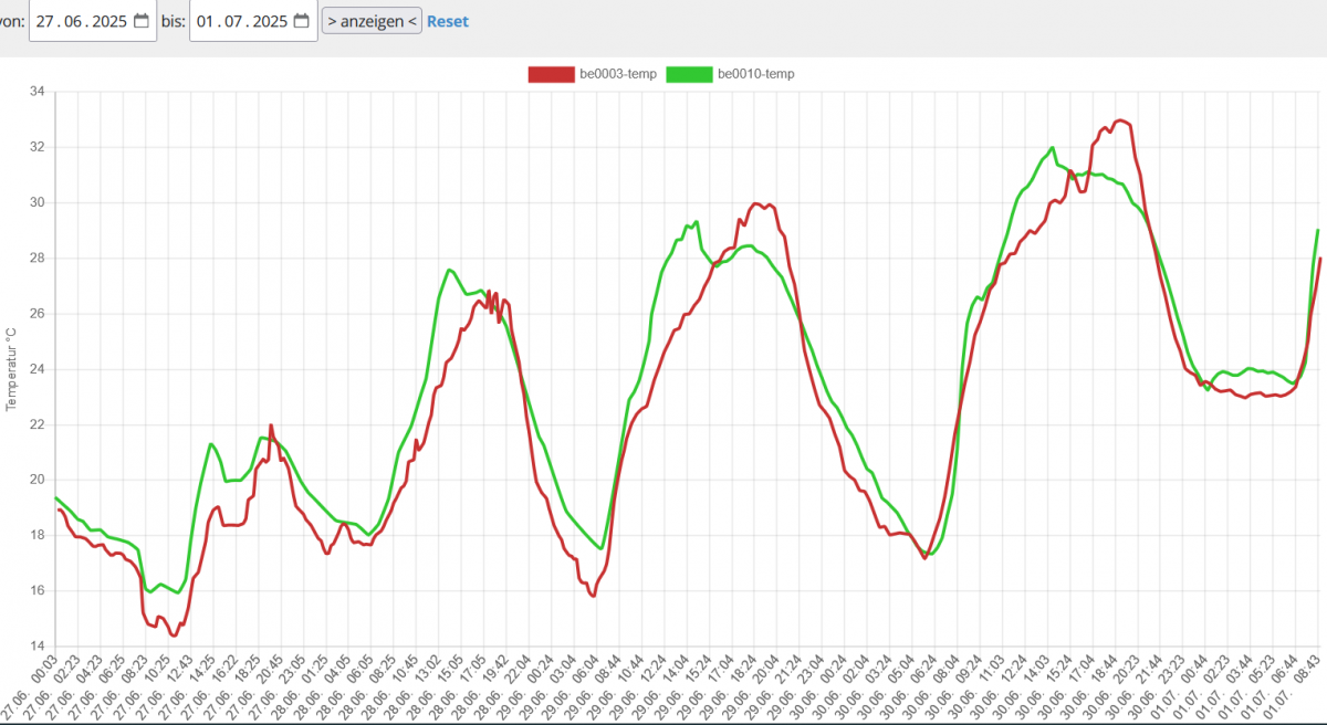Lufttemperaturverlaufskurven an unserer Wetterstation in der Eifel im Zeitraum 27.06. bis 01.07.2025.