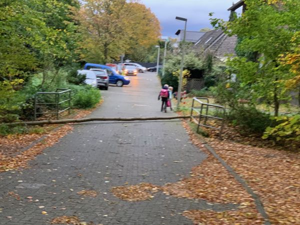 Das Foto zeigt Kinder auf dem Weg zur Schule am heutigen Morgen, im Vordergrund ein umgestürzter Baum.