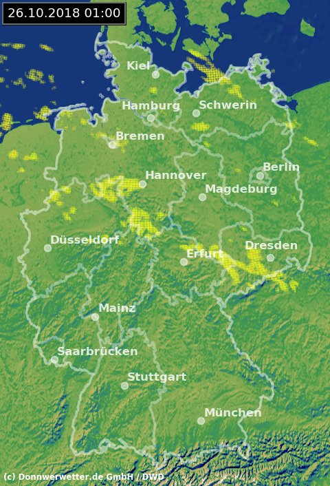Das Radarbild zeigt aktuell vom Münsterland bis nach Sachsen leichte Signale mit etwas Regen oder Sprühregen. Die schwachen Signale im Norden deuten nur vereinzelt auf Regen. Sonst präsentiert sich der Himmel über Deutschlands überwiegend wolkenverhangen und nur örtlich aufgeklart. Die Gipfel der Mittelgebirge sind teilweise in Nebel gehüllt.