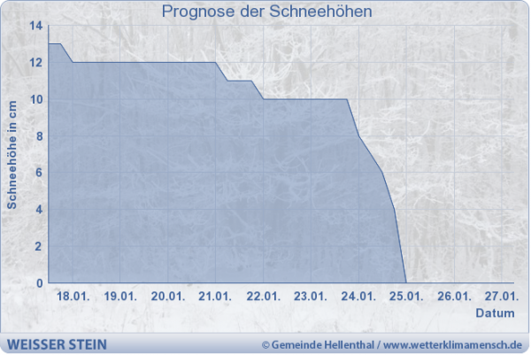 Zumindest in den Mittelgebirgen stehen die Chancen auf ein Schneewochenende sehr gut - das zeigt auch die Schneehöhenprognose für die Eifel (s. Grafik unten). Am Weißen Stein dürfen sich Schneefans am Samstag und Sonntag immerhin noch über 10 bis 12 Zentimeter Schnee freuen.