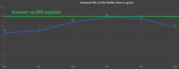 Die Coronajahre 2020 und 2021 beendeten den Aufwärtstrend aufgrund der Lockdowns, dem Trend hin zu Homeoffice und den ausgebliebenen Silvesterfeuerwerken zwar (letztere, aber auch vorherrschende Großwetterlagen spielen bei der Jahresgesamtbilanz übrigens eine erhebliche Rolle und tragen einen nicht unerheblichen Anteil zum gesamten jährlichen Feinstaubausstoß bei); vor allem im Jahr 2021 fällt aber auf, dass trotz der genannten Umstände der Jahresmittelwert viel zu hoch war - und sich, wie in allen Vorjahren, deutlich über dem WHO-Grenzwert von 10 µg/m³ bewegt.