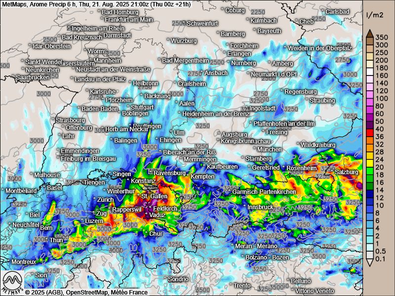 Auch in der Schweiz und Österreich droht am Donnerstag Starkregen - besonders betroffen ist die Ostschweiz, Graubünden und Liechtenstein mit bis zu 120 l/m² in sechs Stunden.