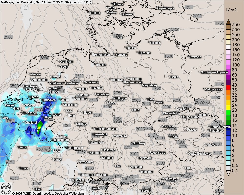 Die beiden folgenden Karten bilden die Sechs-Stunden-Regenmengen sowie die Temperaturen bis Freitagnachmittag sowie die Sechs-Stunden-Regenmengen bis Samstagabend (21:00 Uhr) ab.