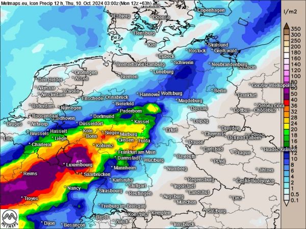 Neben Sturmböen ist in den genannten Gebieten auch mit sehr hohen Regenmengen zu rechnen. Binnen 12 Stunden ist etwa in Luxemburg, Lothringen, dem Saarland und Rheinland-Pfalz mit Gesamtniederschlägen von 50 bis 70 l/m² zu rechnen. Kleinere Hochwasserereignisse an Bächen sind möglich.