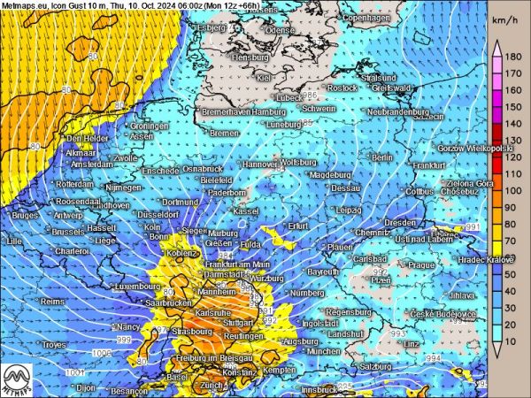In Deutschland sind vor allem Rheinland-Pfalz, das Saarland, Baden-Württemberg und Bayern betroffen. Bei zu erwartenden Spitzenwindböen um 100 km/h und durch die vielfach noch vollständig belaubten Bäume ist von Schäden sowie Beeinträchtigungen vor allem im Schienenverkehr auszugehen.
