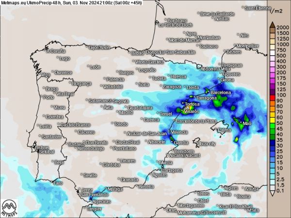 Zunehmend beruhigt sich die Lage in Spanien, zumindest vom Wetter her - die Karte zeigt die Regensumme nach UKMO bis Sonntagabend.