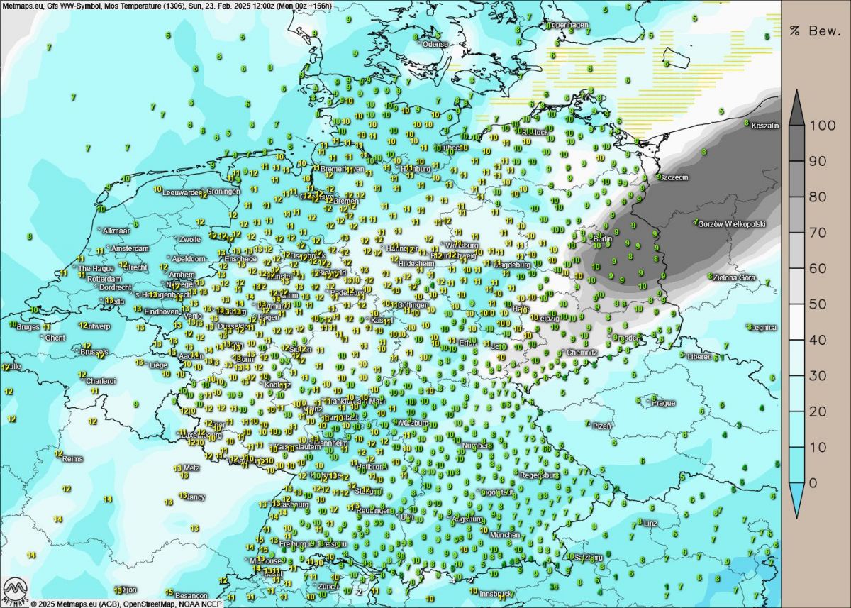 Der Blick auf den freundlichen Wetter- und Wahlsonntag (12:00 Uhr) mit Temperaturen und Bewölkungsgrad nach GFS: