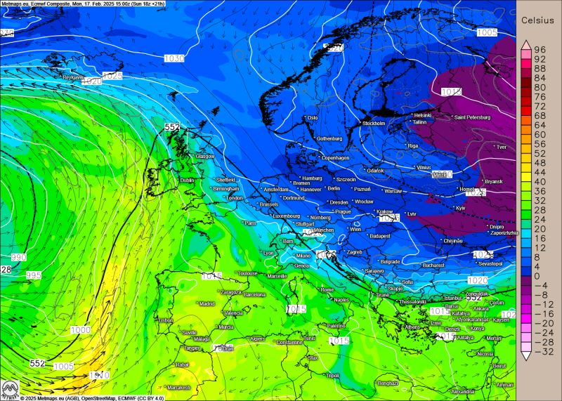 Sitzheizung von Vorteil: Luftdruckkarte für den Montagnachmittag (ECMWF).