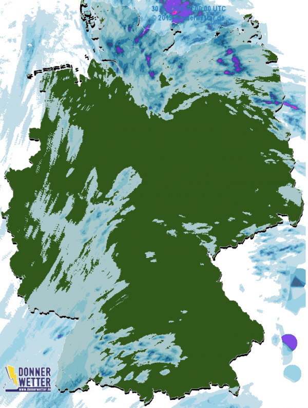 Das Radarbild zeigt aktuell gebietsweise teils stärkere Regen- oder Schauersignale, die von Südwest nach Nordost wandern, vereinzelt blitzt und donnert es dabei auch. Sonst präsentiert sich der Himmel über Deutschland teils wolkenverhangen, teils sternenklar.