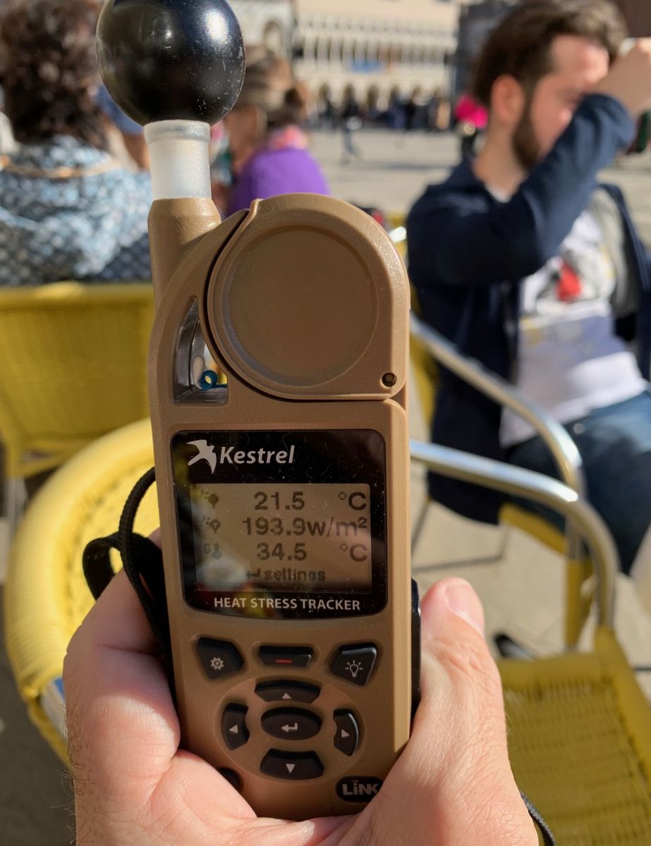 Sobald der Wind abnimmt, steigen die Werte deutlich an: Auf den sonnenbeschienenen Oberflächen des Markusplatzes erwärmen sich die Oberflächen aktuell auf Werte teils über 35 Grad - und das bei einer Lufttemperatur von stolzen 25 bis 27 Grad.