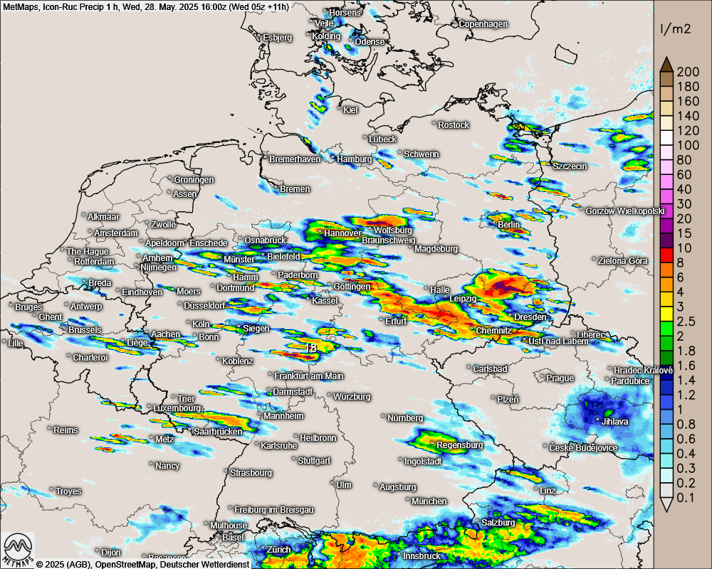 Die aktuellen Modellrechnungen nach ICON mit den stündlichen Niederschlagssummen bis 16:00 bzw. 18:00 Uhr: