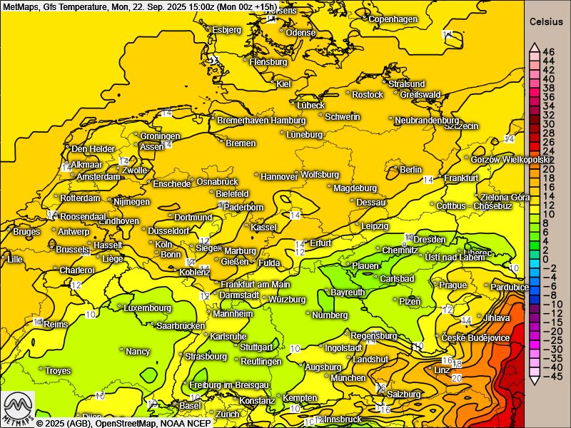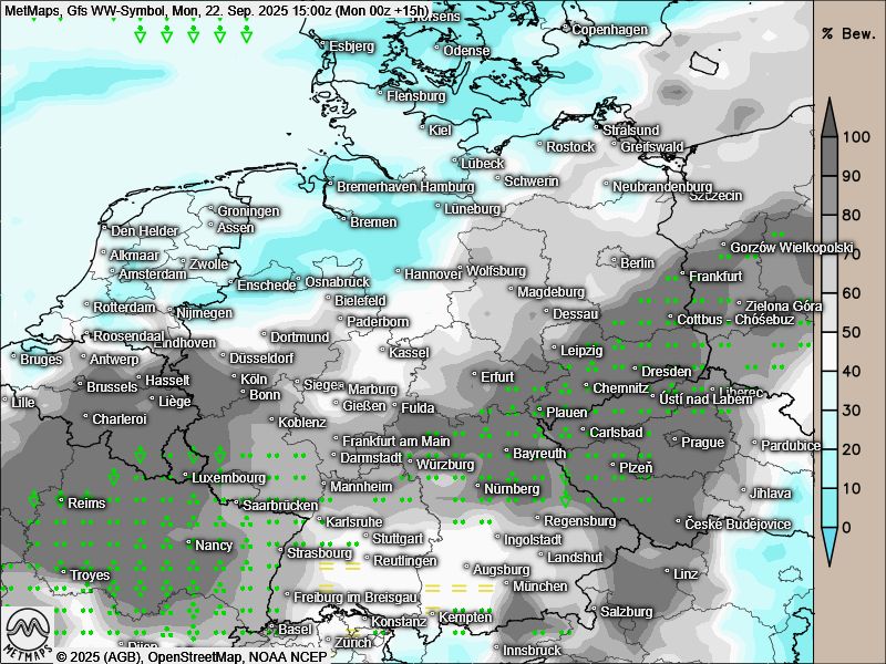 Die Karten zeigen die 12-Stunden Regenmengen sowie Lufttemperaturen und die Bewölkung am Montagnachmittag nach GFS: