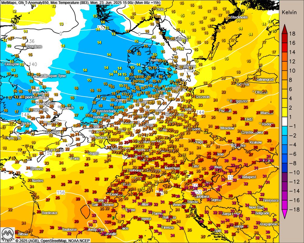 Die Karte bildet Temperaturen und Temperaturanomalie am Montagnachmittag ab.