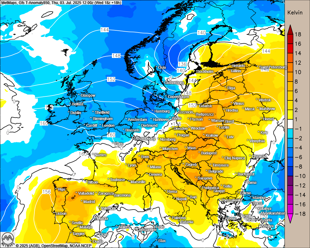 Dass wir es nach der Julihitze in dieser Woche im weiteren Monatsverlauf nochmals mit sehr hohen Temperaturen oder einer weiteren Hitzewelle zu tun bekommen werden, ist wahrscheinlich. Auch die aktuellen Wettermodelle prognostizieren - hier etwa für den 18. Juli - weitere Hitzetage für nahezu das gesamte Land.
