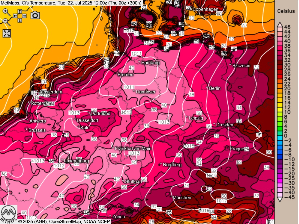 Die Karten bilden die GFS-Lufttemperaturen für Dienstagmittag (22.07.) sowie Freitagmittag (25.07.) ab (Stand: 10.07.) - für Teile Deutschlands sehen die Modelle in über Teile der übernächsten Woche extreme Temperaturen von bis zu 40 Grad.