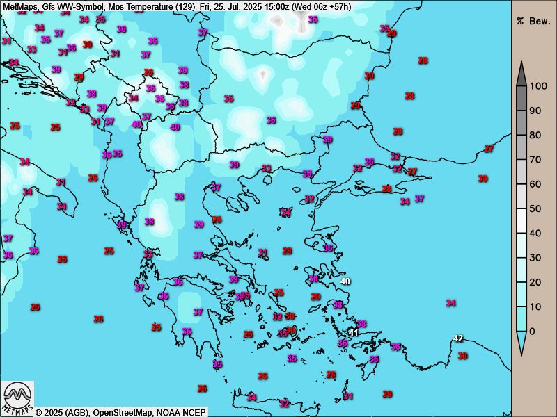 Wie auf dem Satelliten-Infrarotbild erkennbar ist, lagen die Wassertemperaturen heute um die Mittagszeit bei 28 Grad, auf den Oberflächen beliefen sich die Temperaturen auf Werte um 50 Grad. In Teilen der Türkei und Griechenlands sind bis zum Wochenende Lufttemperaturen um 43 Grad zu erwarten.