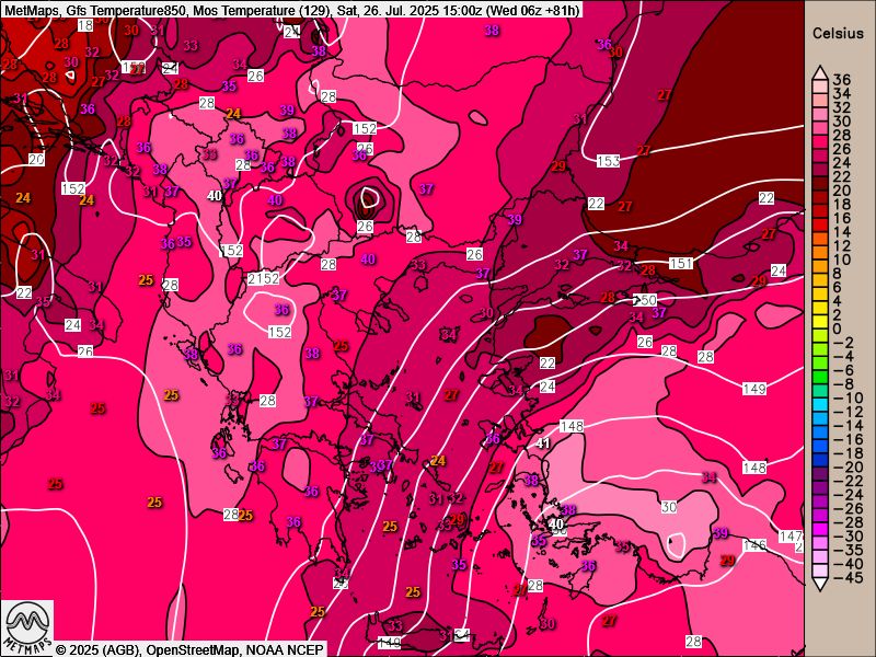 Die beiden folgenden Karten zeigen die MOS-Temperaturen für den östlichen Mittelmeeraum bis Samstag sowie die 850 hPa-Temperaturen mit 30 bis 35 Grad heißer Luft.