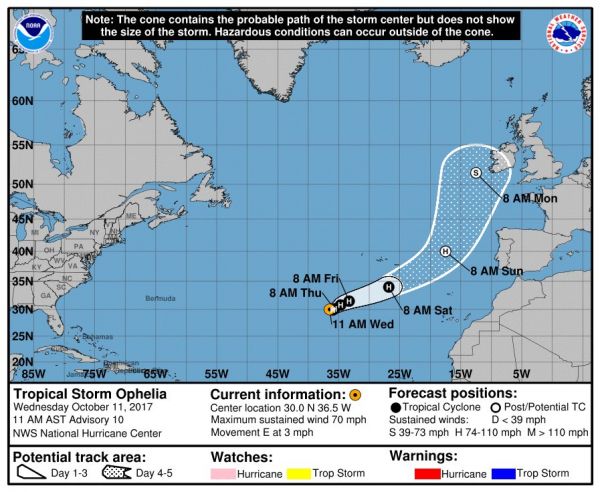 Hurrikane Ophelia zieht zwischen Azoren und Kanaren in Richtung Portugal, später Irladn. Als tropisches Tief wird er nach dem Wochenende in Irland erwartet. Seit langer Zeit wieder ein Hurrikane vor der Haustür in Europa.