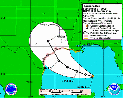 Nach Angaben des Nationalen Hurrikanzentrums der USA erreichte 'Rita' bereits Windgeschwindigkeiten von über 280 Stundenkilometern und wird damit auf der Hurrikan-Skala in der höchsten Kategorie 5 eingestuft. Nach den aktuellen Prognosen wird der Hurrikan zwischen Galveston und Freeport auf Land treffen.