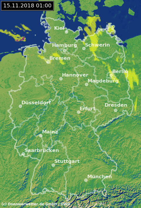 Das Radarbild zeigt aktuell im Nordosten einige leichte Signale mit vereinzeltem Regen oder Sprühregen. Sonst präsentiert sich der Himmel über Deutschland teils bewölkt, teils aufgeklart. Vor allem in der Südhälfte haben sich regional Nebelfelder gebildet.