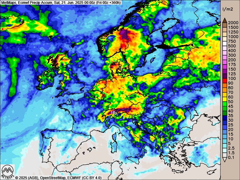 Die beiden Karten bilden die Regenmengen für Europa nach dem US-Modell GFS und dem europäischen Modell ECMWF bis zum kalendarischen Sommeranfang am 21.06. bzw. 22.06. ab - mit vielen Westlagen bleibt es bis dahin häufig nass.