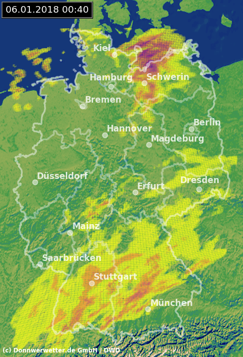Das Radarbild zeigt aktuell über dem Süden noch die leichte bis mäßige Regenzone. Über Mecklenburg-Vorpommern halten sich noch stärkere Regensignale. Sonst ist der Himmel über Deutschland oft noch wolkenverhangen, aber im Westen und Nordwesten aber auch schon häufig sternenklar.