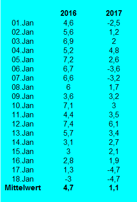 Die Abweichung der Tagesmitteltemperaturen im Vorjahresvergleich zeigt auch unsere Tabelle. Das durchschnittliche Tagesmittel zwischen dem 01.01. und dem 18.01. lag im vergangenen Jahr um 3,6 Grad C über dem diesjährigen Wert. Die Daten stammen von unserer Wetterstation in Bonn: