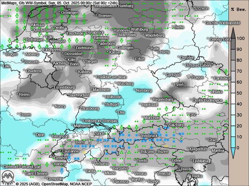 Die aktuelle Warnlage, die Wetterkarte für Sonntag (00:00 Uhr) sowie die Böenkarte für Sonntag (03:00 Uhr) nach GFS: