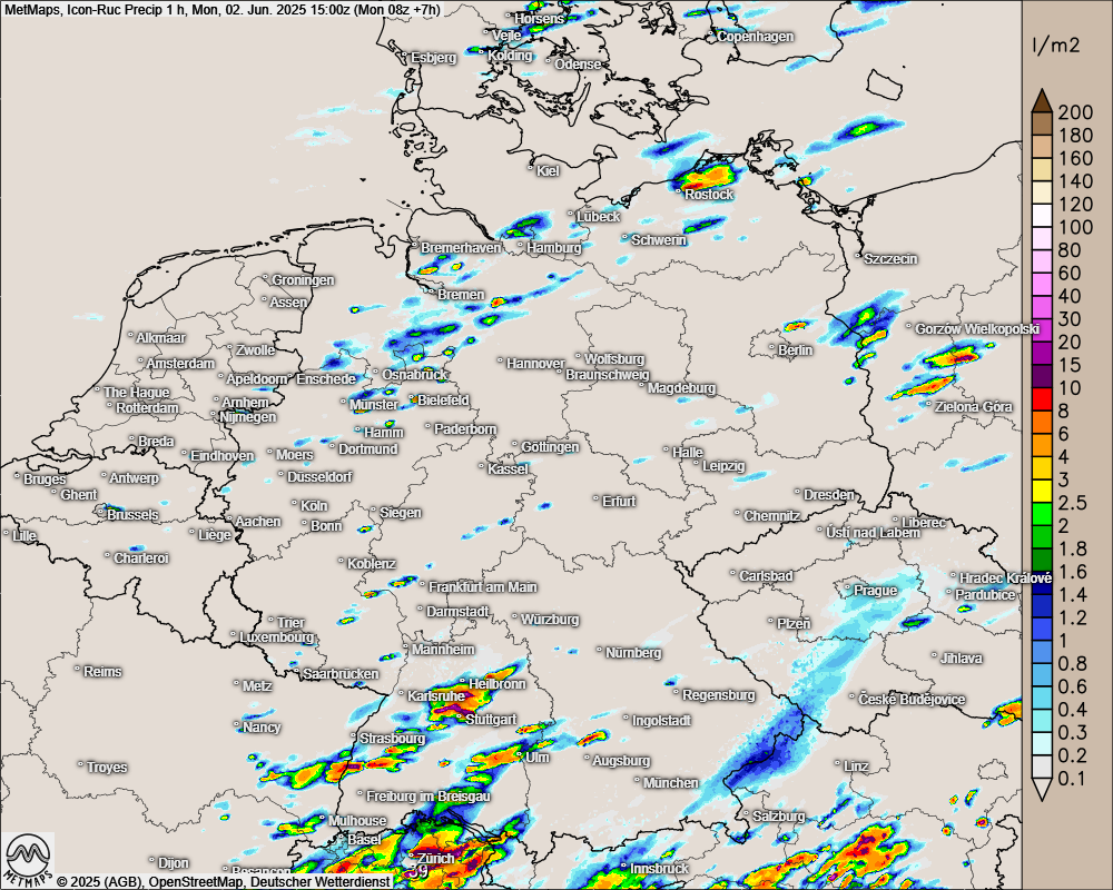 Die Ein-Stunden-Niederschlagsmengen bis 15:00, 16:00 und 20:00 Uhr nach ICON-RUC in der Übersicht: