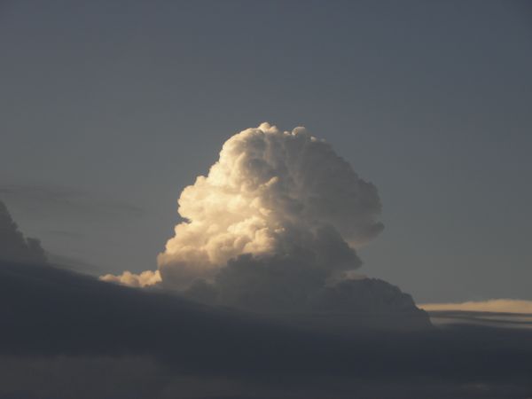 Blick auf eine sich entwickelnde Gewitterwolke über Berlin aus 8 km Höhe im Flugzeug.