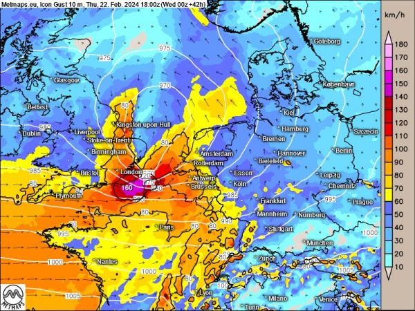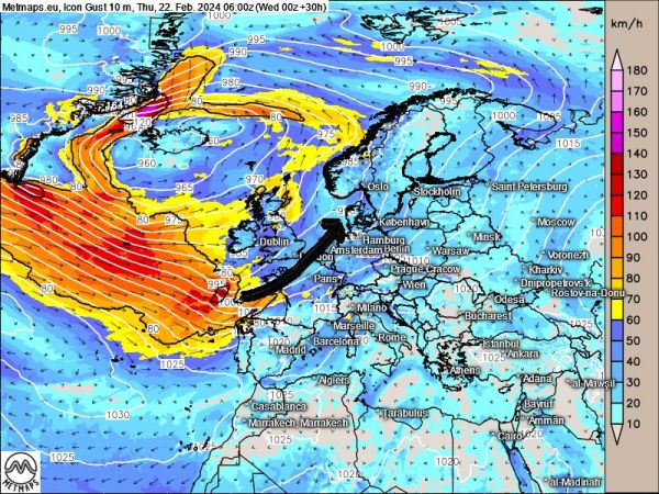 Die Kernstörung ist nur etwa 100 bis 150 km groß, wird aber vor allem dem Süden Englands, Belgien, den Niederlanden und der deutschen Nordseeküste heftige Böen bescheren. Und auch der Westen Deutschlands sollte sich schon einmal "windfest" machen.