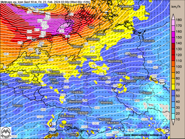 Für die Nacht auf Freitag bzw. Freitagfrüh sind berechnet das deutsche ICON-Modell Böen in Orkanstärke für die deutsche Nordseeküste.